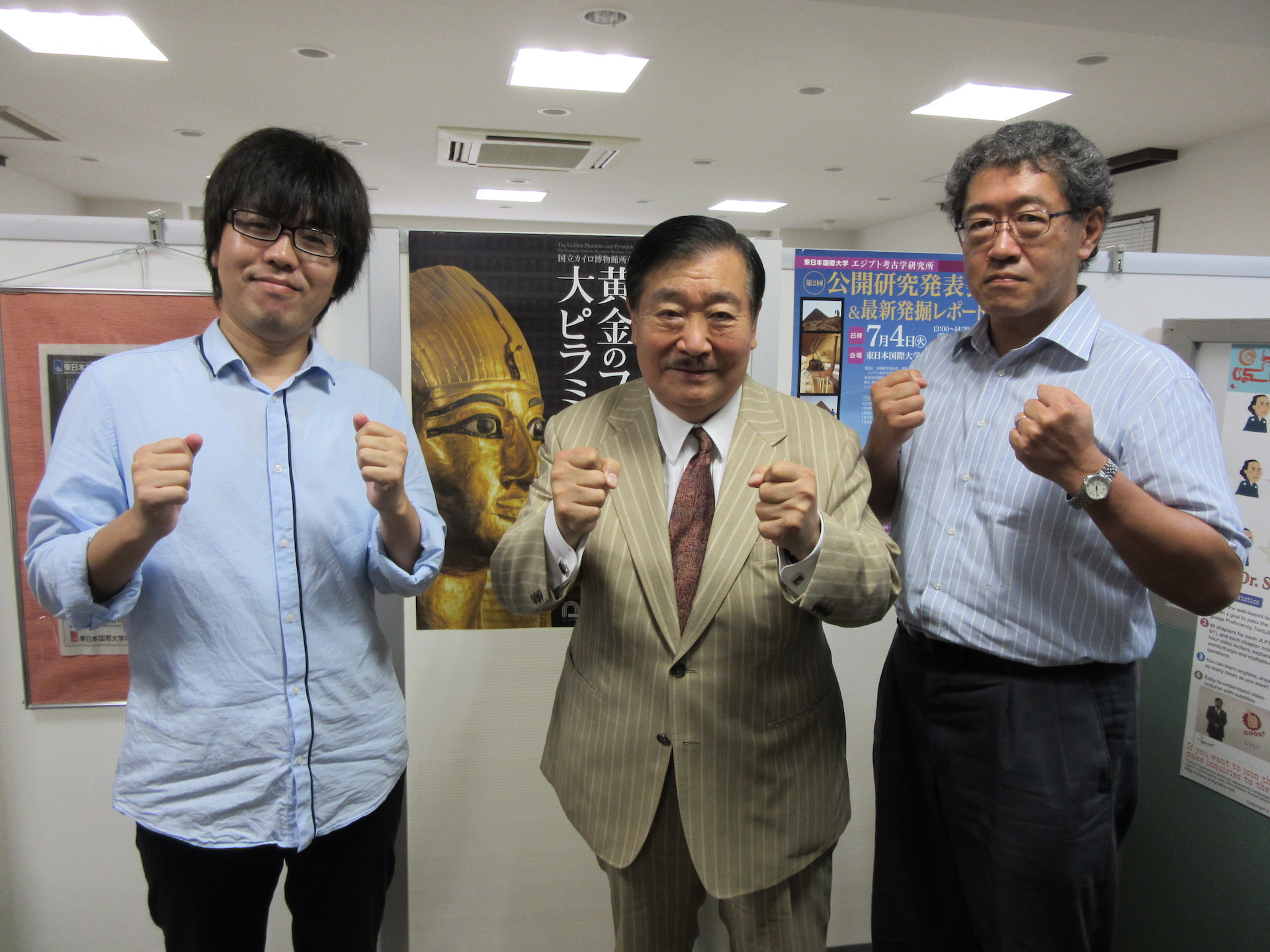右から喜びを分かち合う黒河内宏昌先生、吉村作治先生、高橋寿光先生